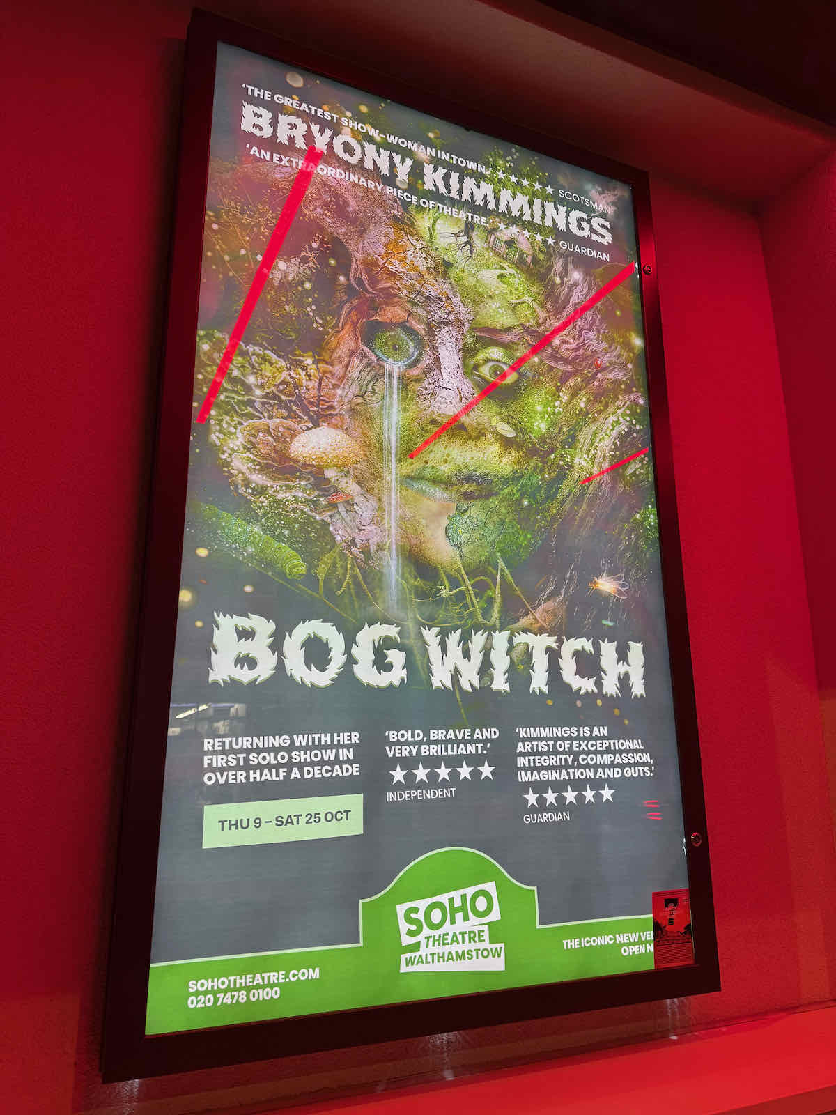Walthamstow’s Soho Theatre, newly reopened in 2025 after major restoration works is a much bigger space than Soho Theatre’s Dean Street venue. At first I wasn’t sure whether Bog Witch worked in such a large venue but much as a fern tendril unfurls itself from a tiny curl to an expansive shady plant, Kimmings’ performance gradually filled the stage with a shadowy roar. The lighting, which starts as mostly a bright white backdrop, evolves through the Bog Witch year to become blacker and scarier, expertly employing gigantic silhouettes. There are a couple of songs – I’d have enjoyed a few more – and a backing track with primary school recorders reminiscent of Britt Eckland’s prancings in The Wicker Man.